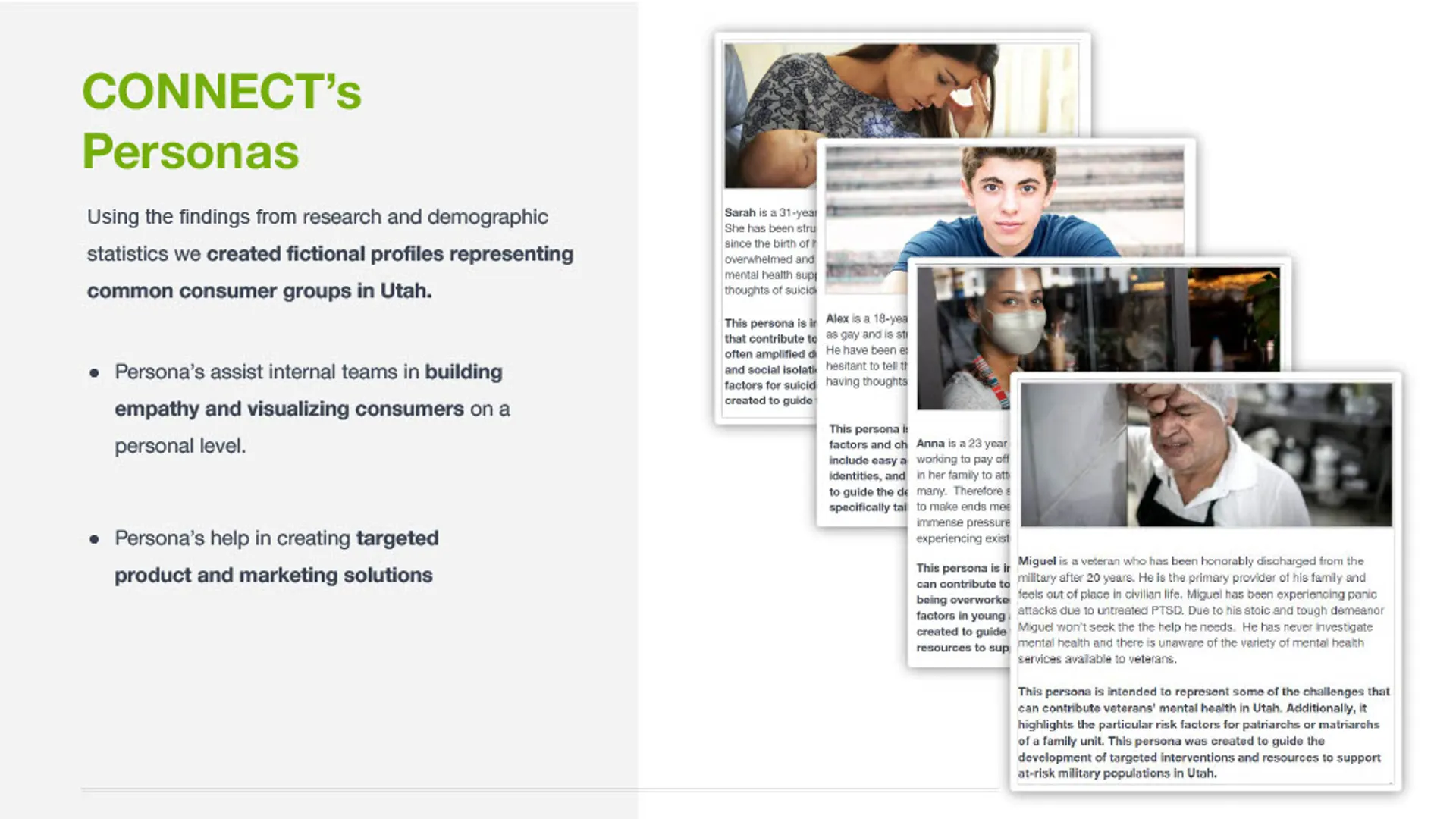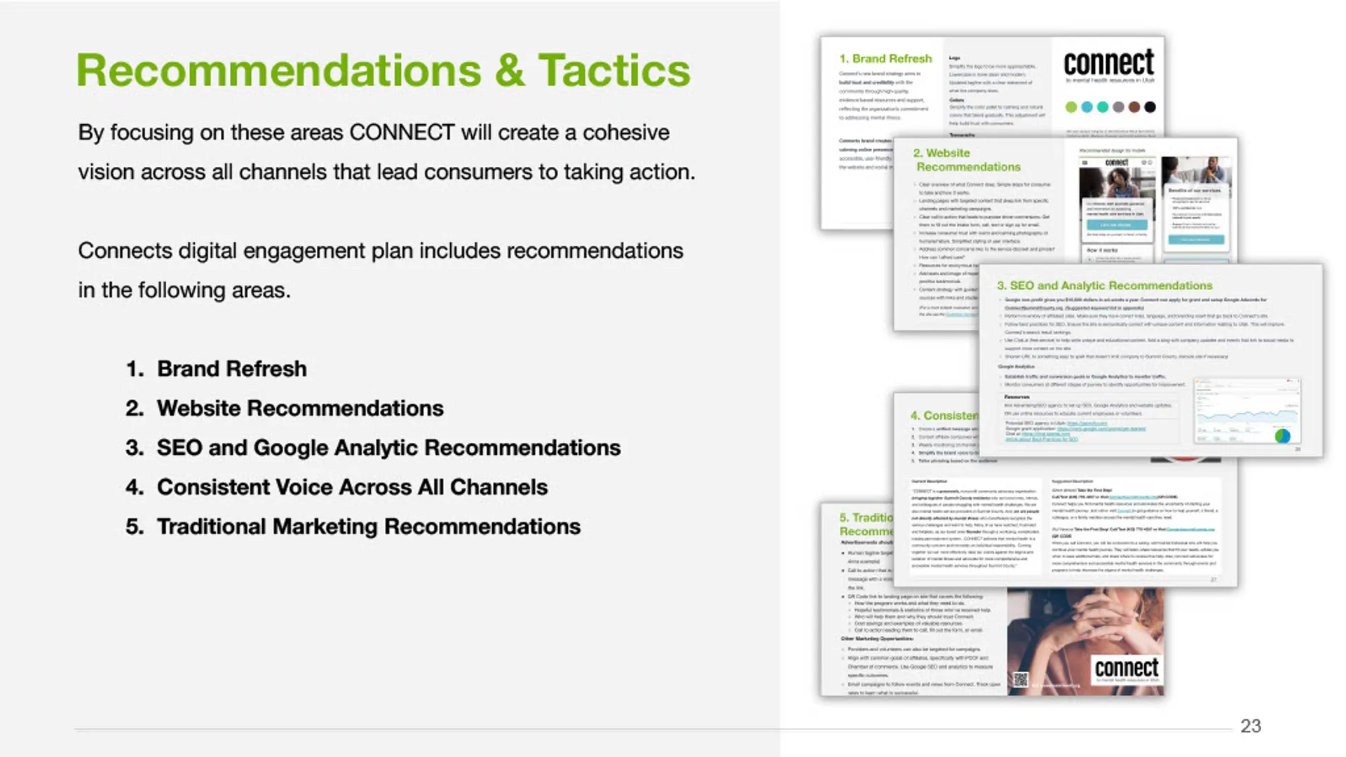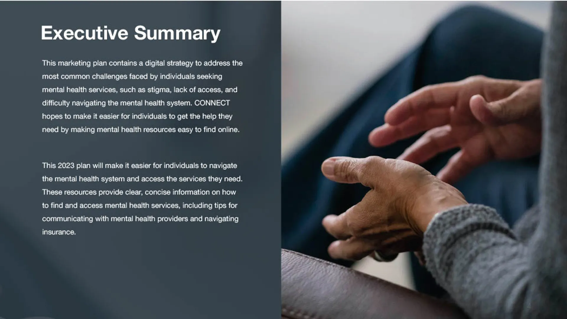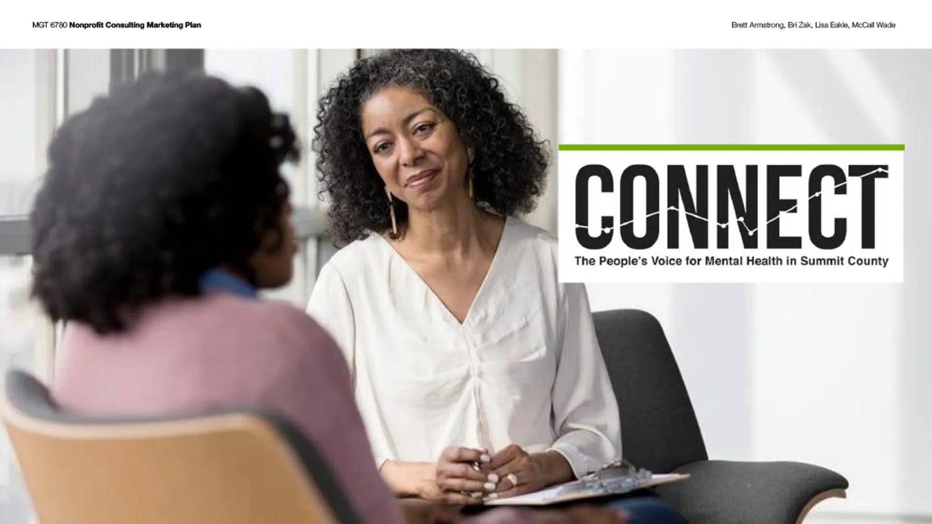 This project delivered a clear, research-informed marketing solution that aligned CONNECT's mission with the needs of the community. Working closely with leadership, the team synthesized stakeholder input, market research, and existing materials to define a focused marketing direction and simplify how CONNECT communicates its value. The outcome was a cohesive marketing plan and consumer-facing presentation that clarified the brand, streamlined the path to services, and supported consistent, high-impact outreach across channels.
