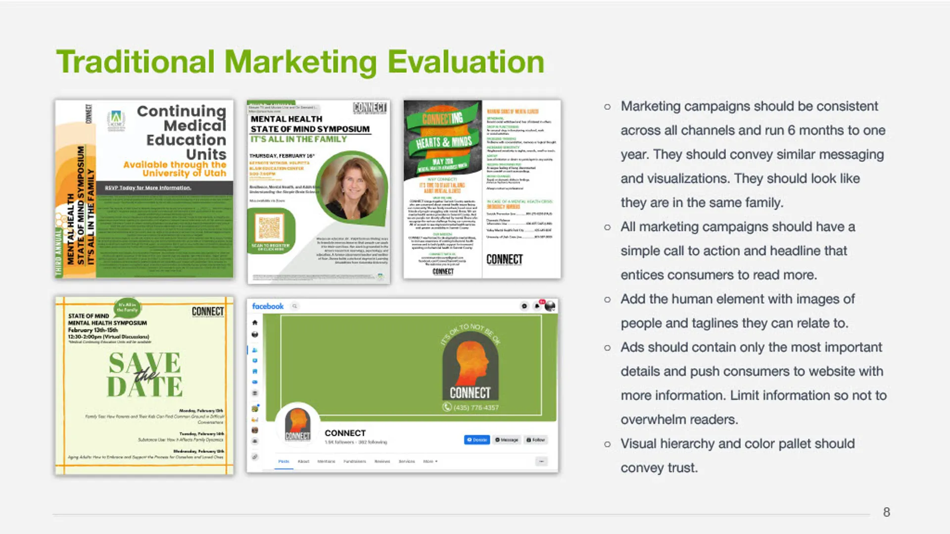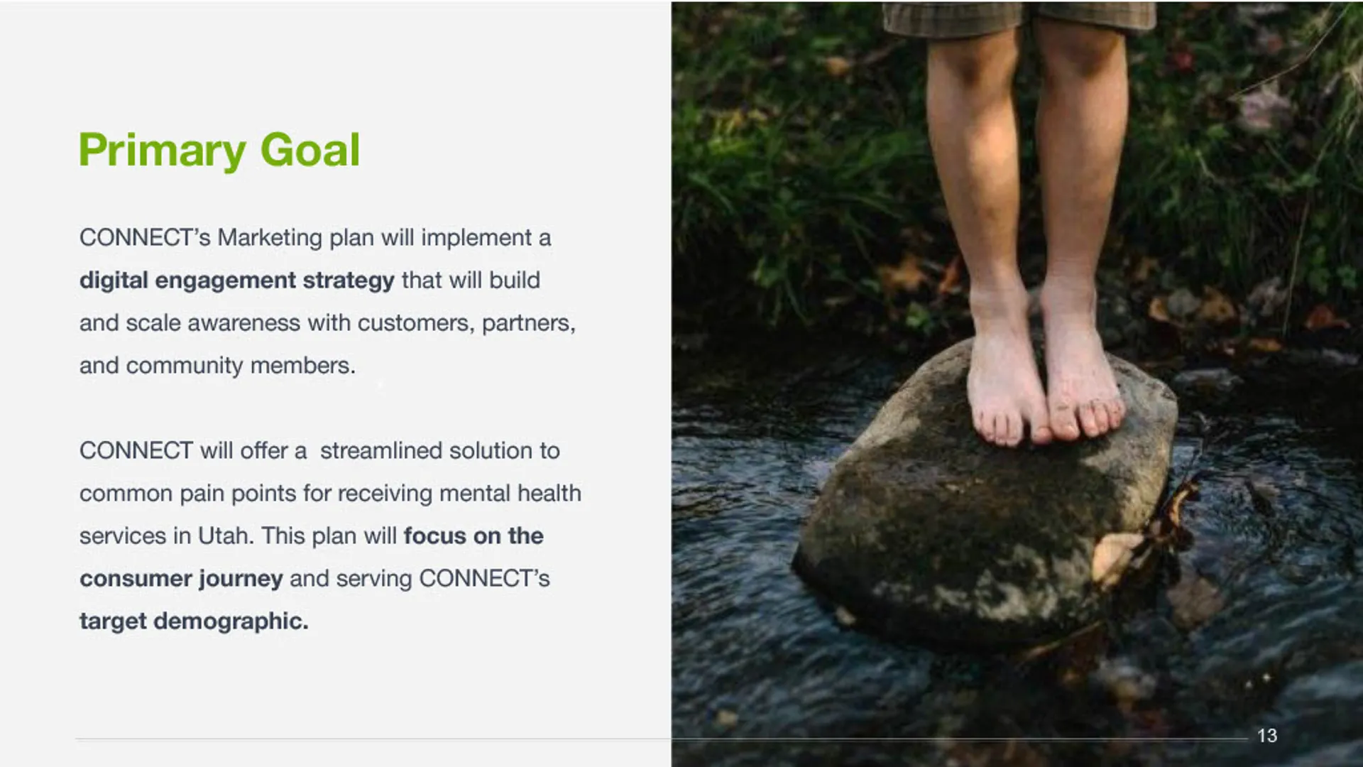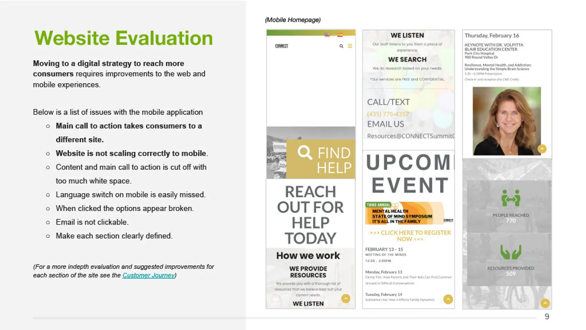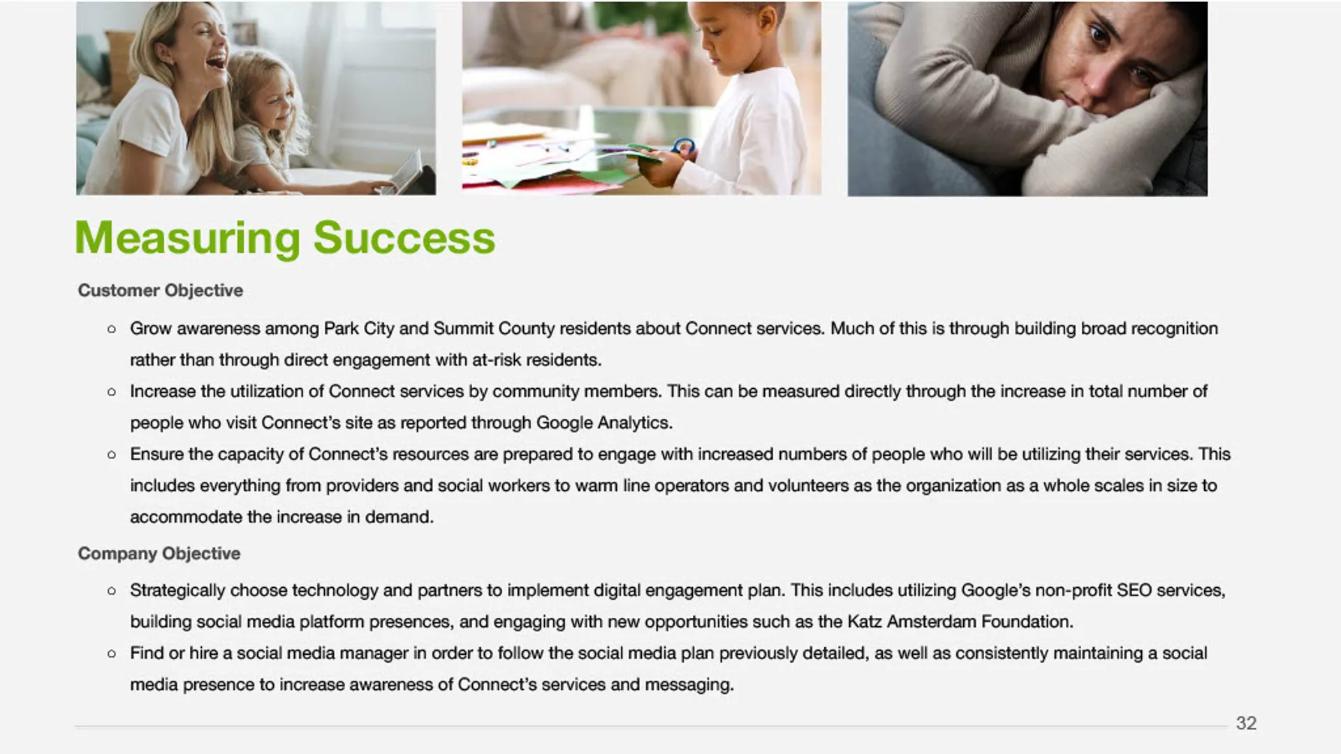 This project delivered a clear, research-informed marketing solution that aligned CONNECT's mission with the needs of the community. Working closely with leadership, the team synthesized stakeholder input, market research, and existing materials to define a focused marketing direction and simplify how CONNECT communicates its value. The outcome was a cohesive marketing plan and consumer-facing presentation that clarified the brand, streamlined the path to services, and supported consistent, high-impact outreach across channels.