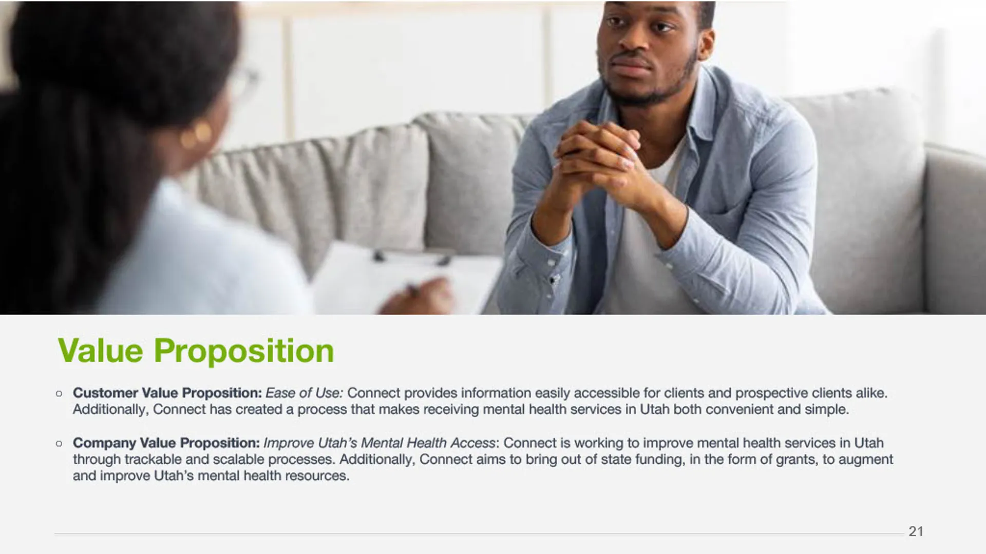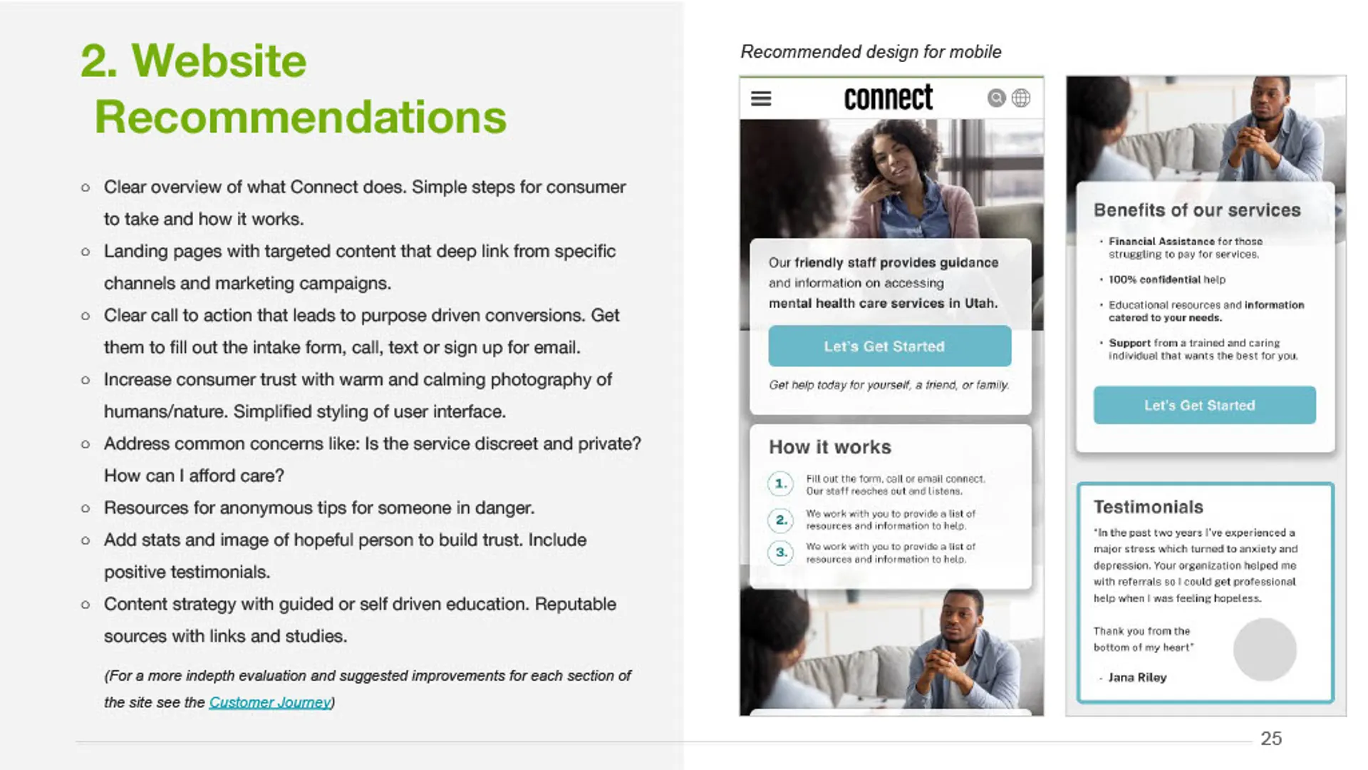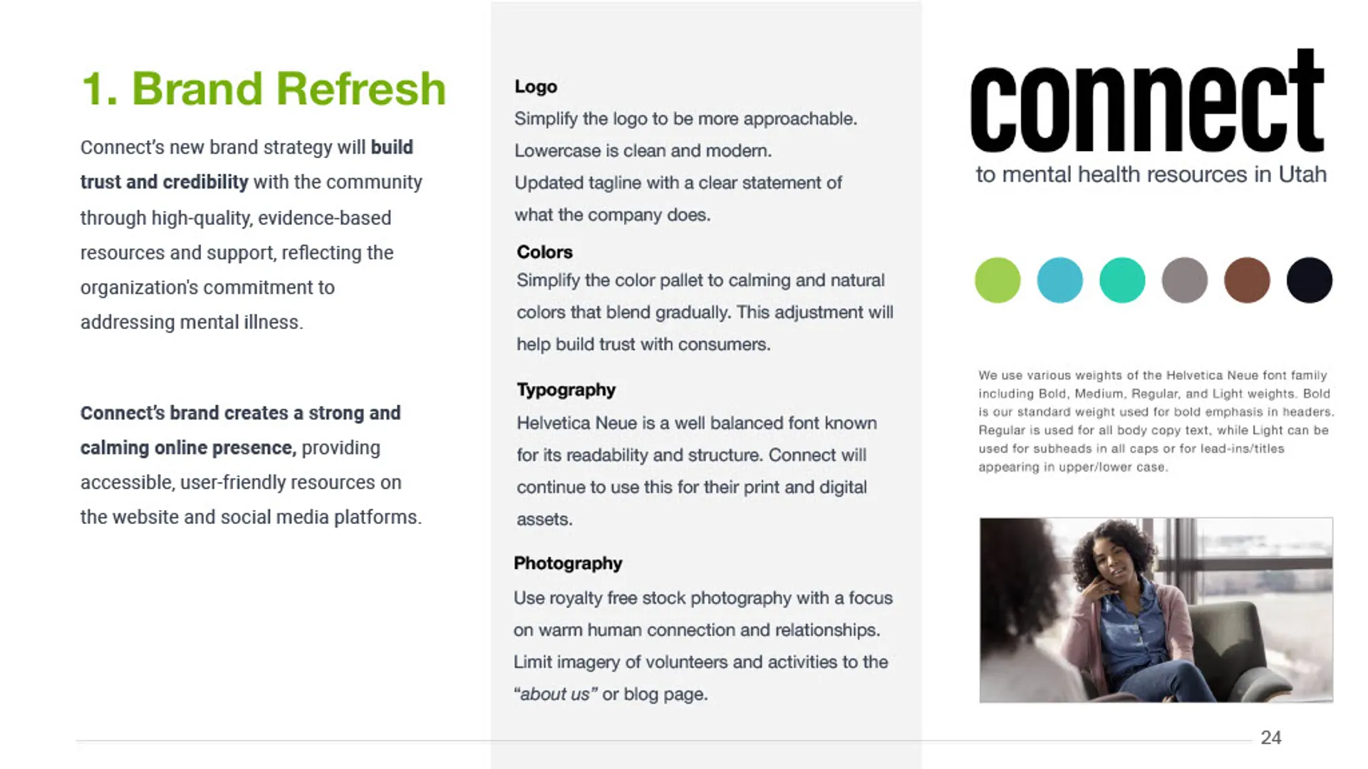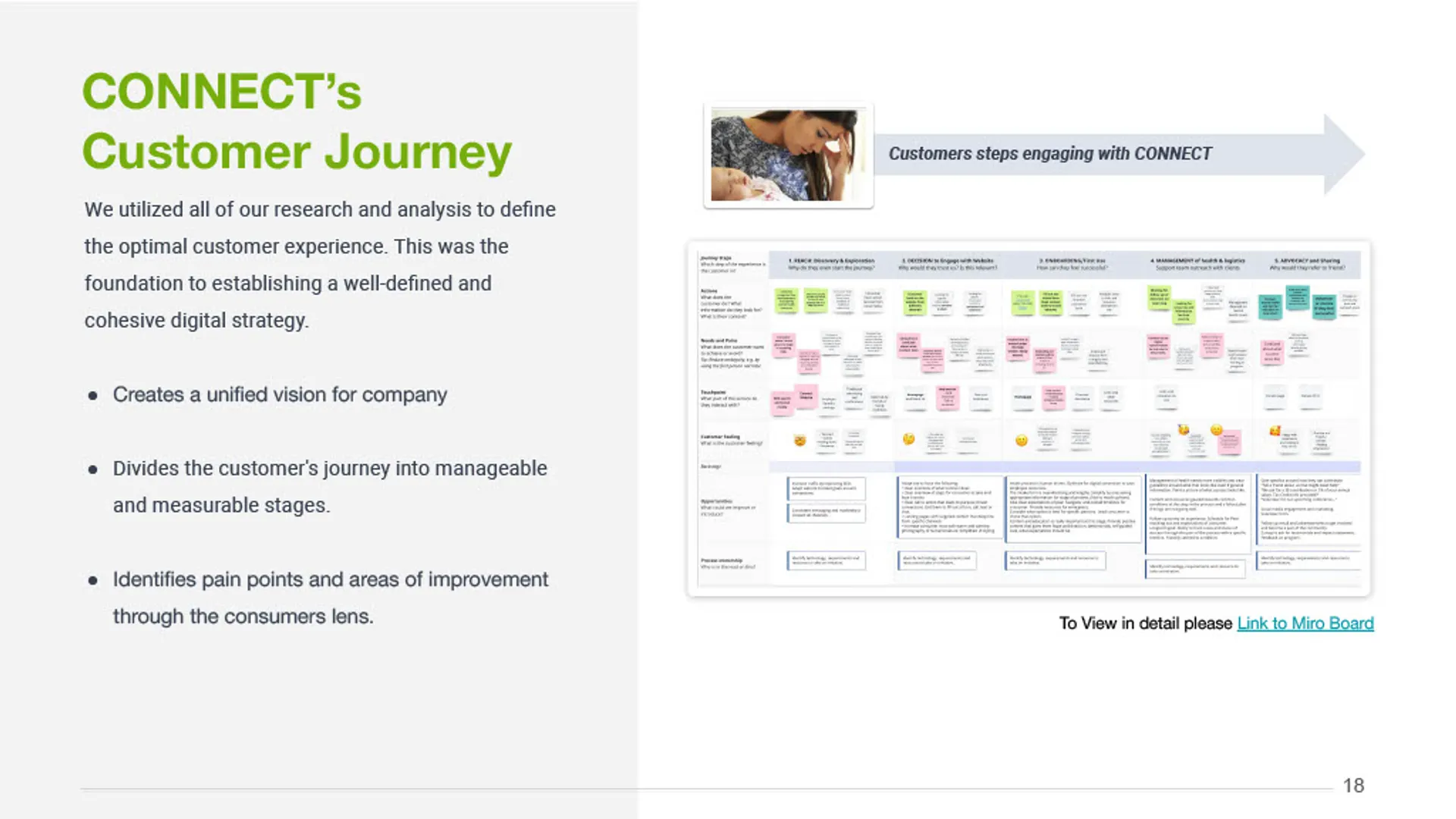 This project delivered a clear, research-informed marketing solution that aligned CONNECT's mission with the needs of the community. Working closely with leadership, the team synthesized stakeholder input, market research, and existing materials to define a focused marketing direction and simplify how CONNECT communicates its value. The outcome was a cohesive marketing plan and consumer-facing presentation that clarified the brand, streamlined the path to services, and supported consistent, high-impact outreach across channels.