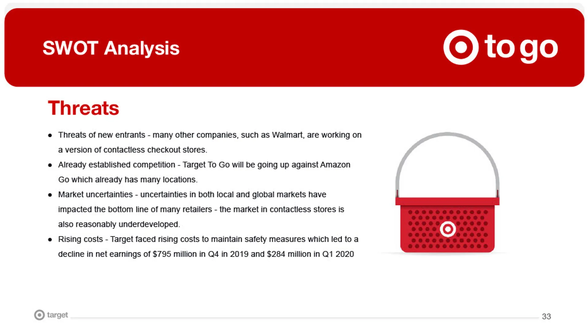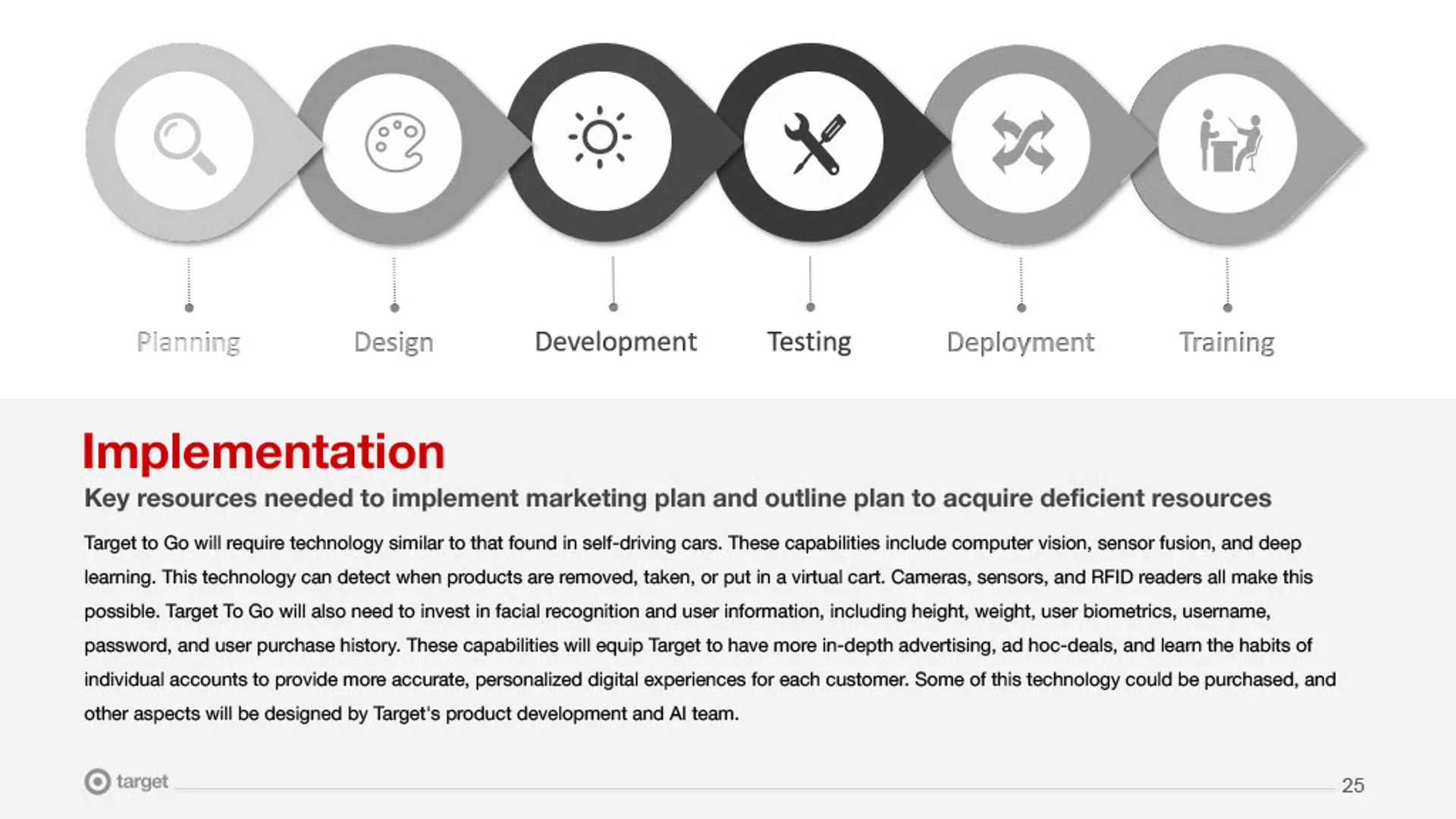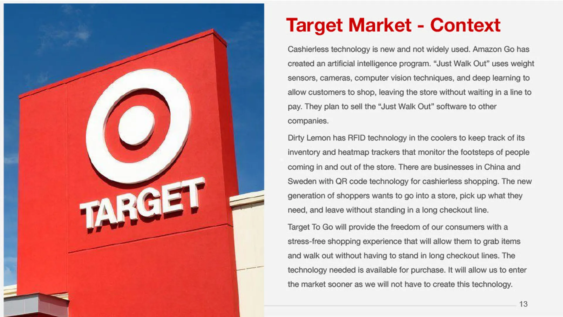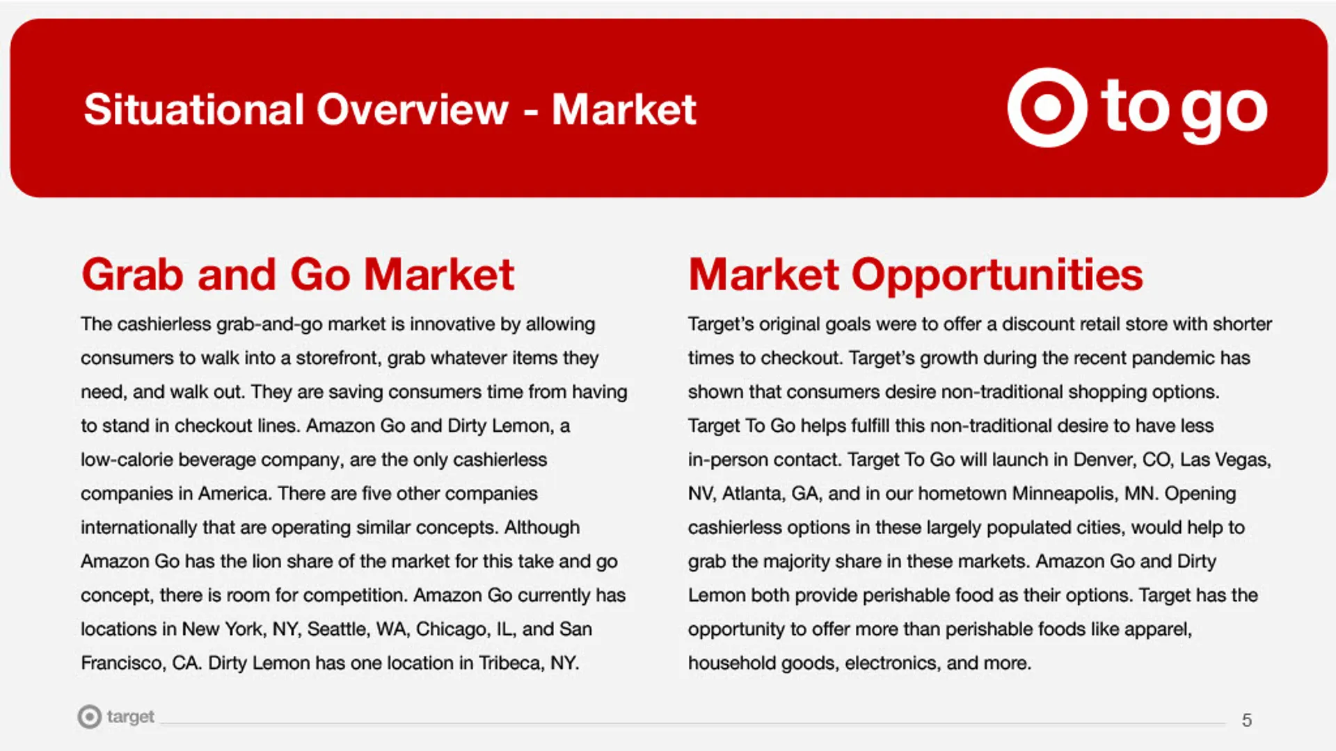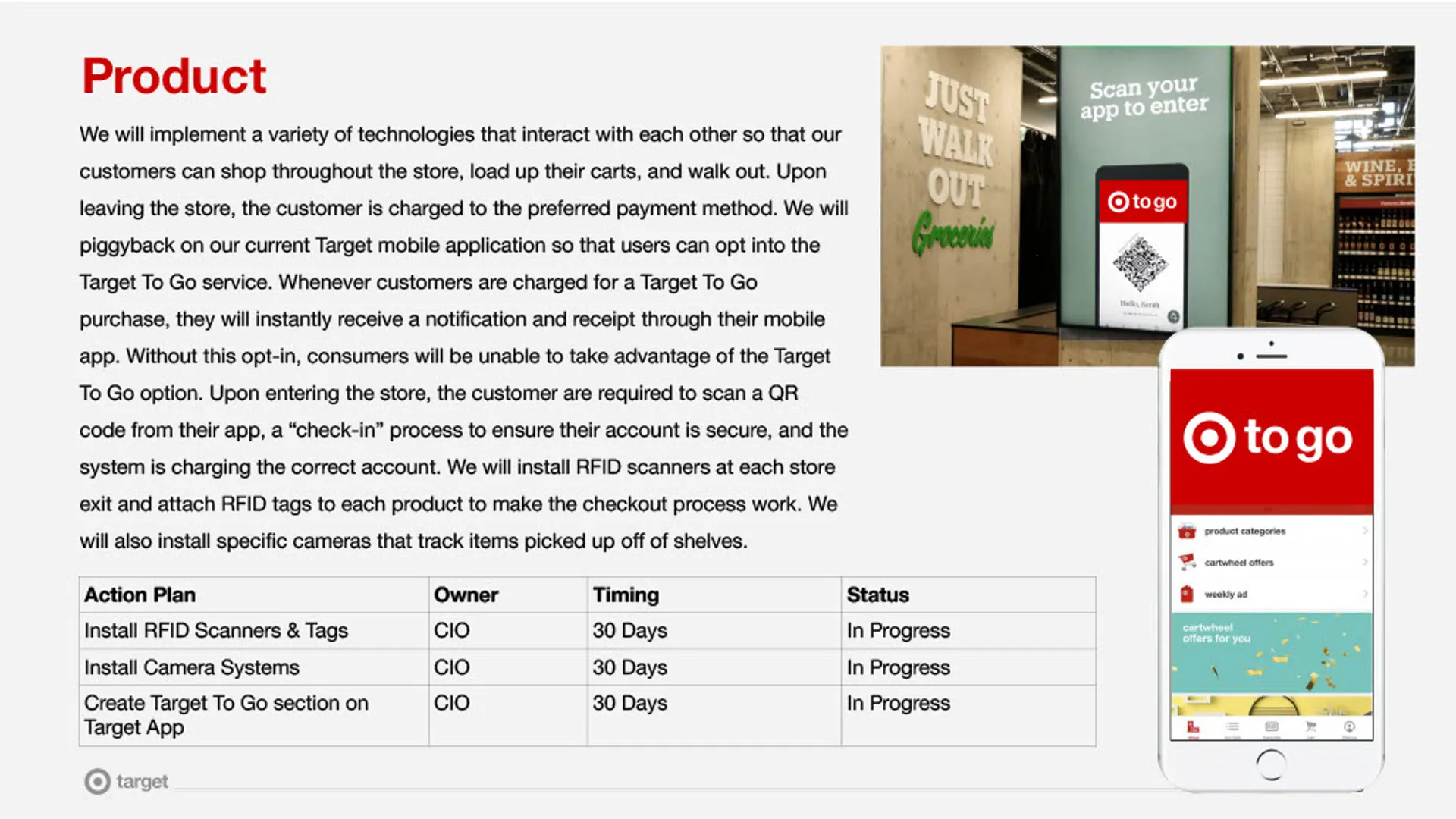 We designed Target To Go, a cashierless, grab-and-go retail concept that allows customers to enter, shop, and leave without waiting in checkout lines. The experience centered on mobile onboarding, in-store guidance, and seamless payment integration, while differentiating Target from competitors by offering apparel, household essentials, and specialty items—not just groceries. The final marketing plan demonstrated how research-driven marketing and design could reduce friction, improve convenience, and support scalable innovation in physical retail.