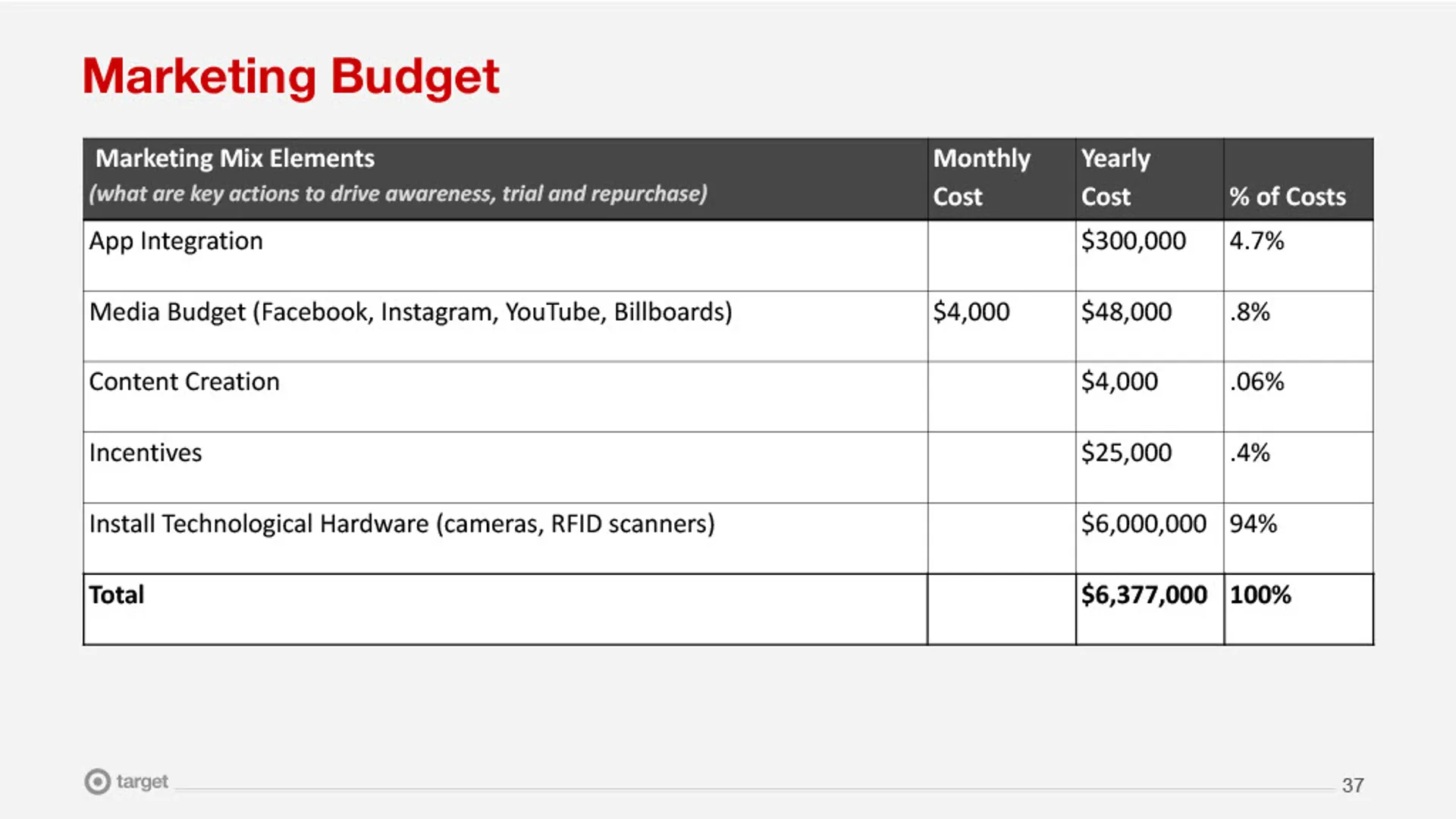• Achieve 65% market awareness and 3% market share in the cashierless segment.